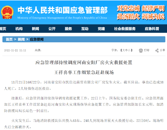 11月21日16時22分,河南省安陽市文峰區(高新區)寶蓮寺鎮平原路凱信達商貿有限公司發生火災。據應急管理部消息,截至11月22日11時,事故共造成38人死亡,89人成功逃生。