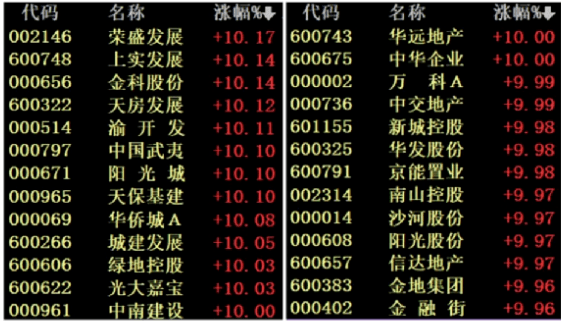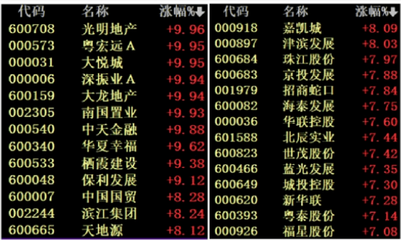 房地產板塊掀起“漲停潮”,中交地產、中國武夷4連板,天房發展、渝開發、臥龍地產、空港股份、城建發展、光大嘉寶、中華企業、京能置業、沙河股份、世榮兆業、陽光股份、信達地產、光明地產、深振業A、大龍地產、南國置業競價漲停。港股方面,多只內房股盤中漲超20%。