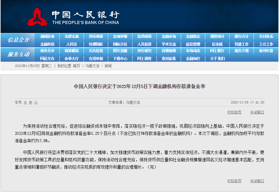 在國務院常務會議“預告”降準后,中國人民銀行隨即表示將于2022年12月5日降低金融機構存款準備金率0.25個百分點(不含已執行5%存款準備金率的金融機構)。本次下調后,金融機構加權平均存款準備金率約為7.8%。中國人民銀行有關負責人介紹稱,此次降準共計釋放長期資金約5000億元,降低金融機構資金成本每年約56億元。