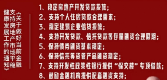 據了解,“三支箭”系列利好政策還包括:適時適度運用降準等貨幣政策工具,保持流動性合理充裕;人民銀行、銀保監會正式發布16條金融舉措,全面支持樓市平穩健康發展。