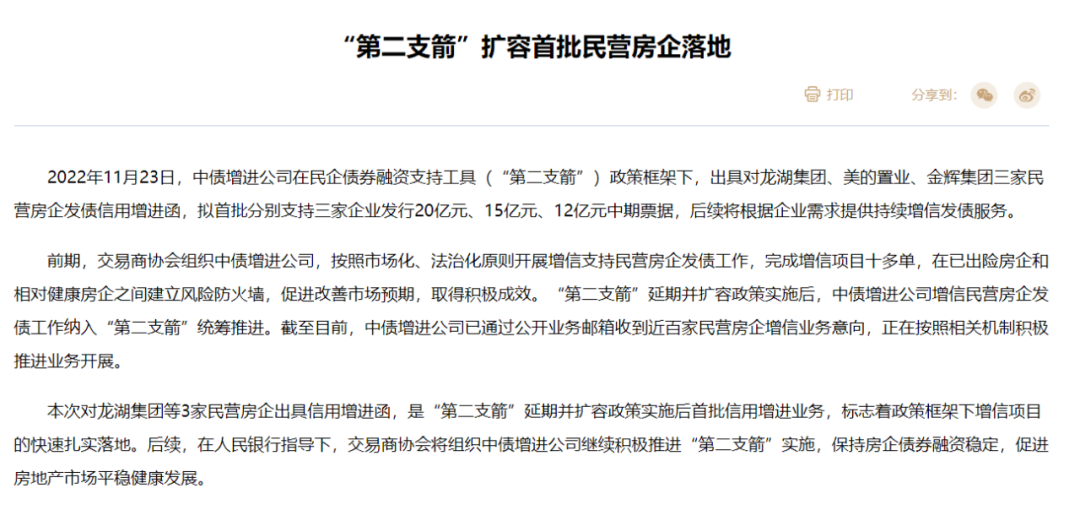 同日,中國銀行間市場交易商協會發文稱,已對龍湖集團、美的置業、金輝集團三家民營房企發債信用增進函,合計支持三家企業發行近50億元的中期票據,后續將根據企業需求提供持續增信發債服務。