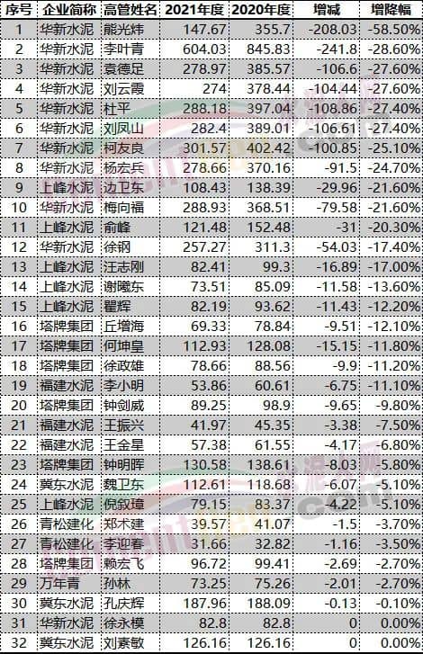 上市公司2021年財報顯示,水泥行業年薪過百萬的75位水泥上市公司高管中有30位薪酬下降,占比達40%。華新水泥、上峰水泥、塔牌集團、福建水泥、冀東水泥部分高管薪酬較2020年有所減少,其中華新水泥7位高管薪酬均有100萬元以上的減少。