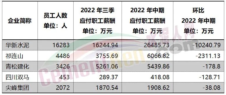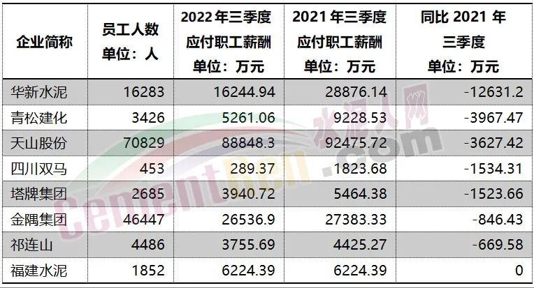 從上市公司三季度應付職工薪酬可見,華新水泥、青松建化、天山股份、四川雙馬來、塔牌集團、金隅集團、祁連山等七家水泥企業應付職工薪酬同比2021年三季度均有所下滑。其中華新水泥同比下滑約1.27億元。福建水泥應付職工薪酬同比未增未減,考慮物價上漲因素,未增減也相當于“降薪”。