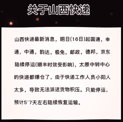 山西當(dāng)?shù)赝ㄖ?2月16日起,申通、圓通、中通、韻達(dá)、極兔快遞、郵政、德邦、京東等陸續(xù)停運(yùn)(順豐時效受影響),太原中轉(zhuǎn)中心快遞爆倉,無法派送,只能停運(yùn),預(yù)計5-7天左右陸續(xù)恢復(fù)運(yùn)輸。
