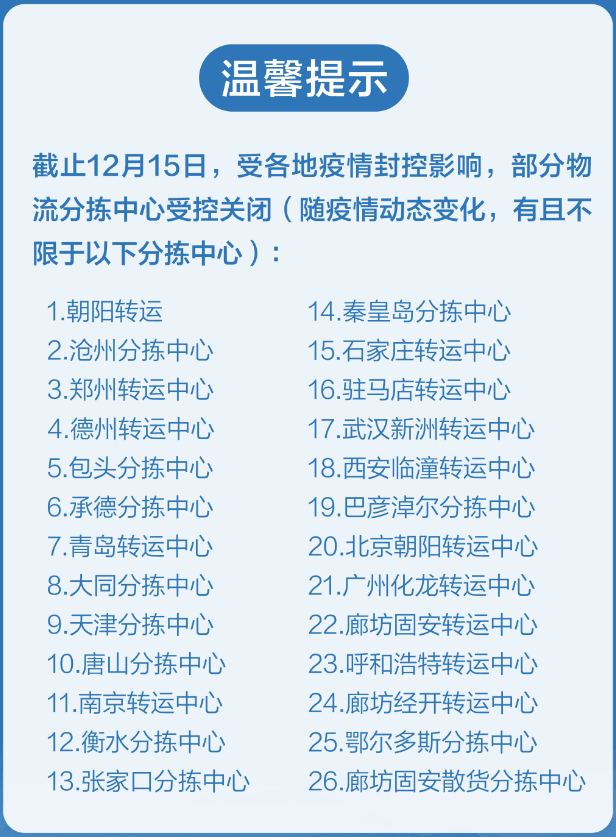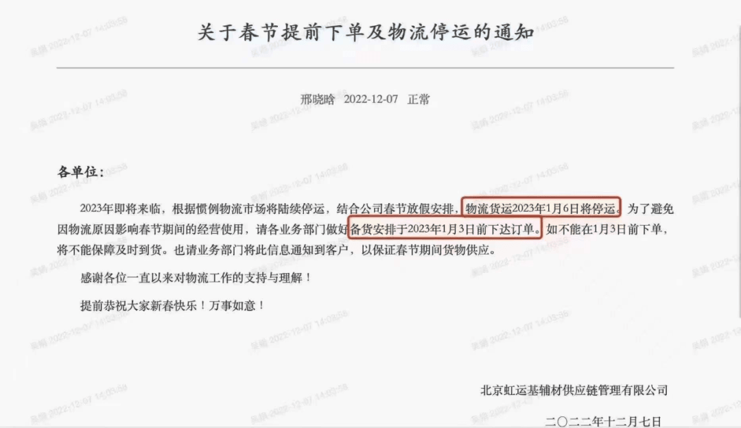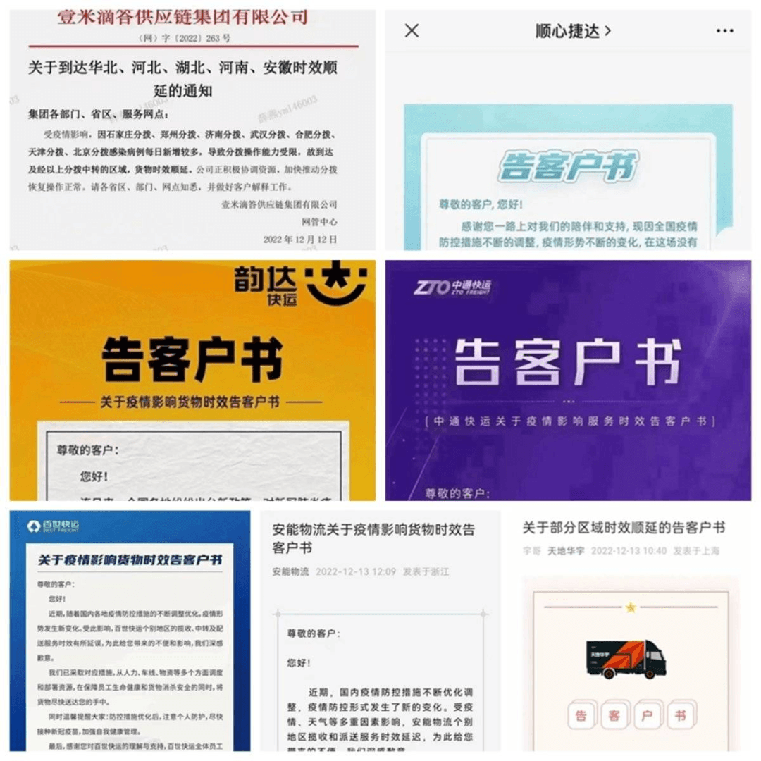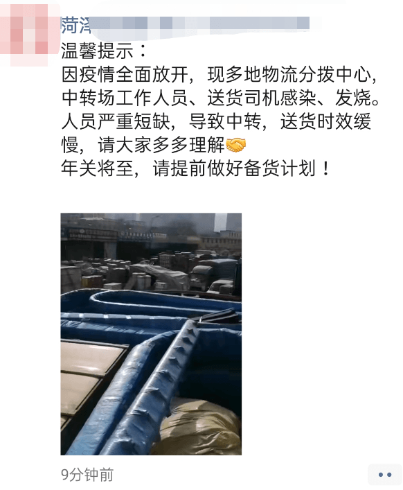 山東菏澤一企業(yè)溫馨提示稱:“因疫情全面放開,現(xiàn)多地物流分撥中心中轉(zhuǎn)場工作人員、送貨司機(jī)感染、發(fā)燒人員嚴(yán)重短缺,導(dǎo)致中轉(zhuǎn),送貨時效緩慢,請大家多多理解個年關(guān)將至,請?zhí)崆白龊脗湄浻媱?”
