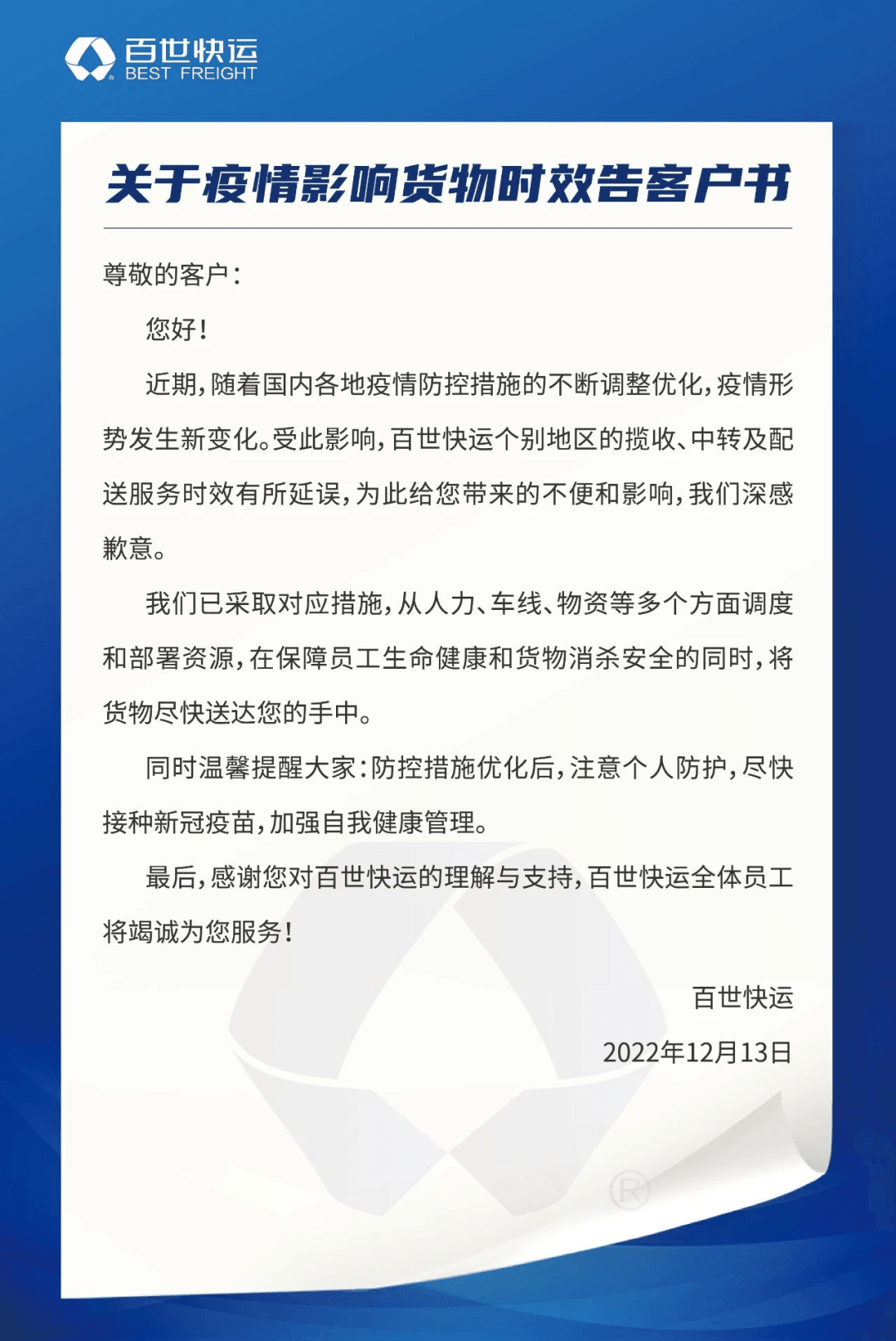 百世快運(yùn)表示,隨著國內(nèi)各地疫情防控措施的不斷調(diào)整優(yōu)化,疫情形勢發(fā)生新變化,受此影響,百世快運(yùn)個別地區(qū)的攬收、中轉(zhuǎn)及配送服務(wù)時效有所延誤。