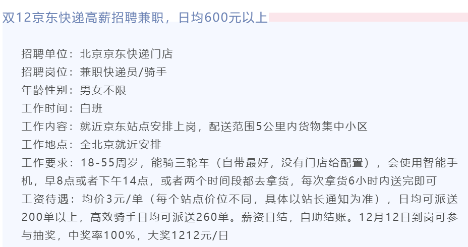 為解決北京“末端投遞”的問題,京東物流在12月14日下午從全國調(diào)集的首批1000余名快遞小哥已陸續(xù)抵達(dá)北京,定向增援北京市內(nèi)的快遞配送等工作。他們于15日起陸續(xù)投入到北京全市的快遞配送工作中,后續(xù)還將有數(shù)百名小哥在本周內(nèi)抵京。