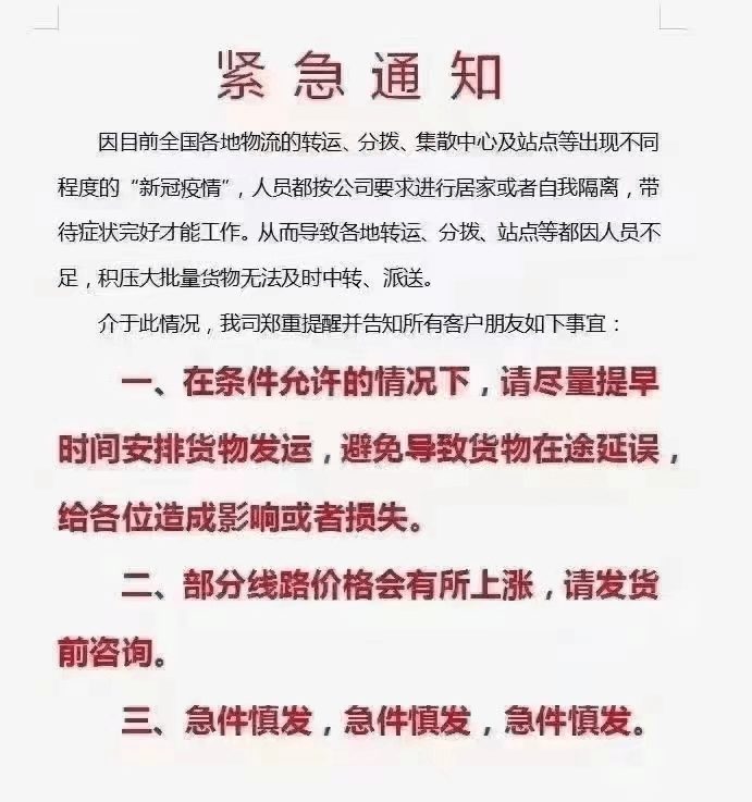 因疫情影響,順心捷達(dá)、安能物流、中通快運(yùn)、百世快運(yùn)、韻達(dá)快運(yùn)、壹米滴答、華宇物流等快運(yùn)公司相繼發(fā)布了告客戶書,告訴客戶受疫情影響比較嚴(yán)重,可能會出現(xiàn)送發(fā)貨不及時甚至部分地區(qū)不發(fā)貨情況。