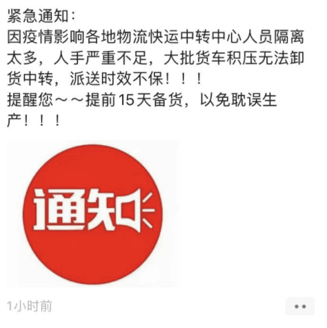另一企業(yè)發(fā)緊急通知稱:“因疫情影響各地物流快運(yùn)中轉(zhuǎn)中心人員隔離太多,人手嚴(yán)重不足,大批貨車積壓無法卸貨中轉(zhuǎn),派送時效不保!!!提醒您:提前15天備貨,以免耽誤生產(chǎn)!”