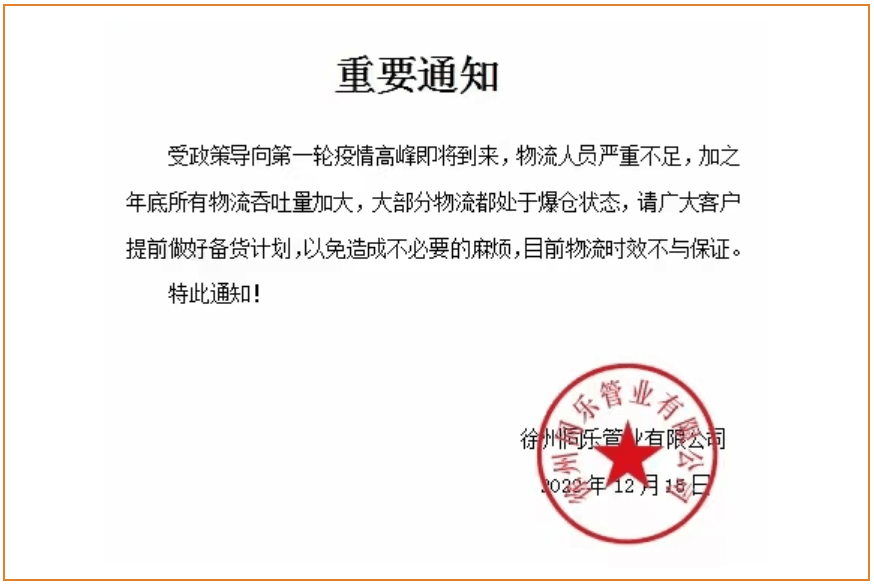徐州同樂管業(yè)重要通知:“受政策導(dǎo)向第一輪疫情高峰即將到來,物流人員嚴(yán)重不足,加之年底所有物流吞吐量加大,大部分物流都處于爆倉狀態(tài),請廣大客戶提前做好備貨計劃,以免造成不必要的麻煩,目前物流時效不保證。”
