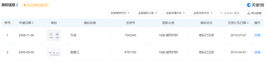 企業商標注冊信息顯示,旗下共有“萬凌”和“鴛鴦江”兩個注冊品牌,并沒有不合格品所列的“粵華水泥”注冊商標。