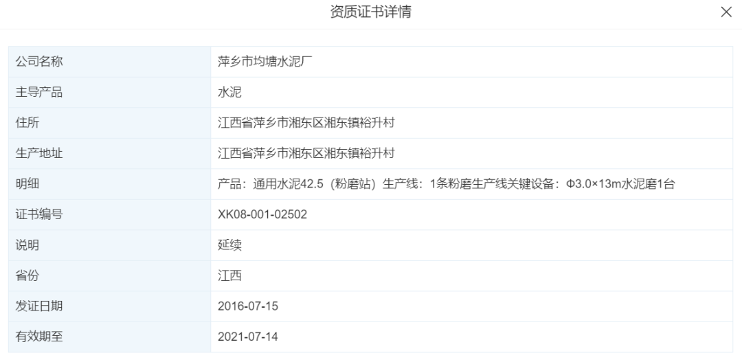 據查詢,萍鄉市均塘水泥廠生產類型為粉磨站,生產許可證編號為XK08-001-02502。該編號生產許可證有效期截止到2021年7月14日,目前已處于無效狀態。且“普樂夫”品牌亦非該企業自有。