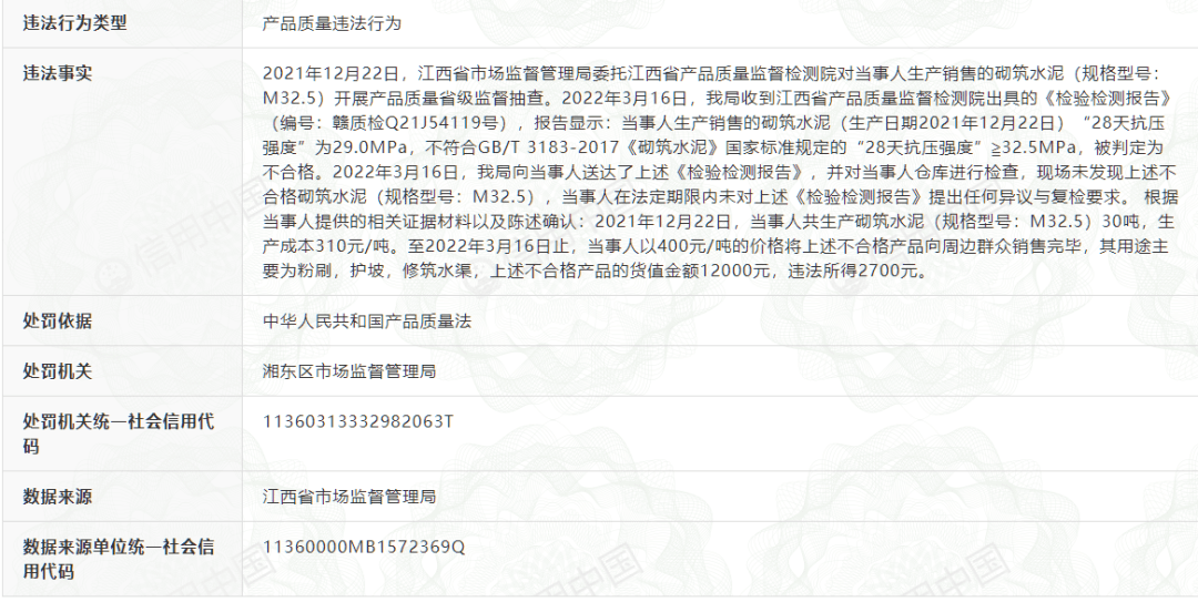 據查詢, 因生產銷售不合格水泥萍鄉市均塘水泥廠被罰沒人民幣25500元。