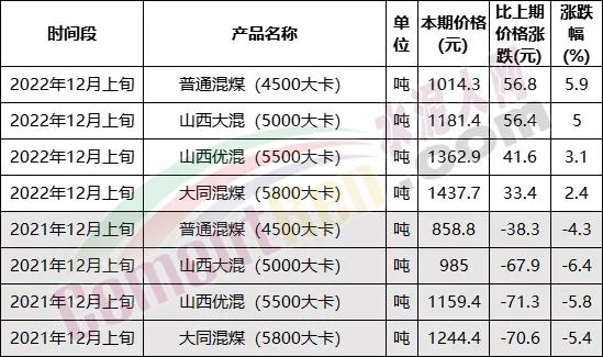 盡管煤價(jià)處于持續(xù)下跌中已有一個(gè)多月,但相比上年同期煤價(jià)仍處于高位。日前,國(guó)家統(tǒng)計(jì)局發(fā)布的2022年12月上旬流通領(lǐng)域重要生產(chǎn)資料市場(chǎng)價(jià)格變動(dòng)情況顯示,4500-5800大卡動(dòng)力煤?jiǎn)蝺r(jià)仍在千元以上,同比上年同期仍有155.5~203.5元/噸的差價(jià)。