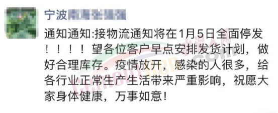 寧波一企業(yè)通知稱:接物流通知將在1月5日全面停發(fā)。望各位客戶早點安排發(fā)貨計劃,做好合理庫存。疫情放開,感染的人很多,給各行業(yè)正常生產(chǎn)、生活帶來嚴(yán)重影響。