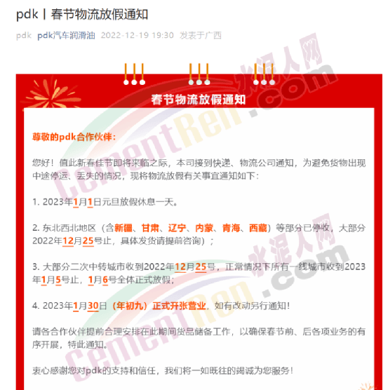 pdk汽車潤滑油春節(jié)物流放假通知稱,公司接到快遞、物流公司通知,為避免貨物出現(xiàn)中途停運、丟失的情況,2023年1月1日元旦放假休息一天。