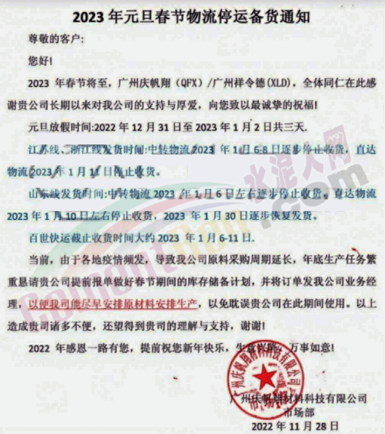 廣州慶帆翔材料科技有限公司通知,江蘇、浙江發(fā)貨時間中轉(zhuǎn)物流2023年1月6~8日逐步停止發(fā)貨,直到物流2023年1月11日停止收貨;山東發(fā)貨時間,中轉(zhuǎn)物流2023年1月6日左右逐步停止發(fā)貨,直達(dá)物流2023年1月10日左右停止收貨,2023年1月30日逐步恢復(fù)發(fā)貨。百世快運截止收貨時間大約2023年1月6-11日。