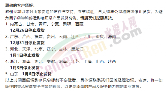 據(jù)水泥人網(wǎng)了解,目前已有多家物流公司發(fā)布春節(jié)停運的通知。受大多物流公司停運影響,各行各業(yè)產(chǎn)業(yè)鏈的運行均受到一定的影響,相繼出現(xiàn)發(fā)貨困難、配套供應(yīng)緊缺及生產(chǎn)任務(wù)加重的問題。
