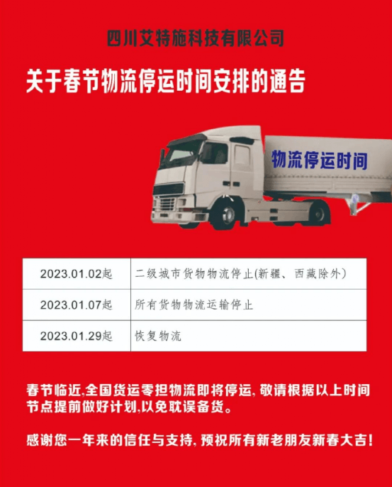 四川艾特施科技通知,2023年1月2日起二級城市貨物物流停止(新疆、西藏除外)。2023年1月7日起所有貨物物流運輸停止。2023年1月29日起,恢復(fù)物流。