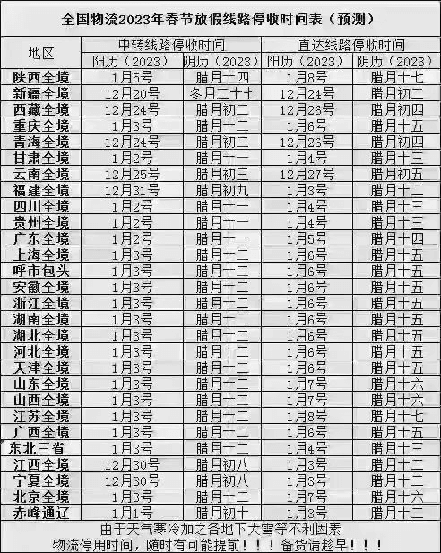 據(jù)網(wǎng)傳全國物流2023年春節(jié)放假停收時間表預(yù)測,中轉(zhuǎn)線路停收時間最早從12月20日開始,直達(dá)線路停收時間最早從12月24日開始。