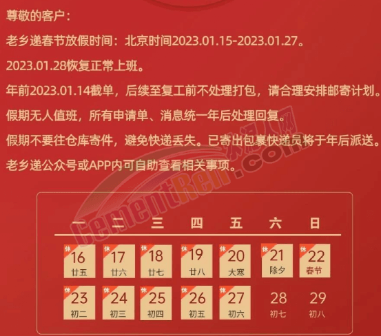 “老鄉(xiāng)遞”春節(jié)放假時間為2023年1月15日至1月27日,1月28日恢復(fù)正常上班。年前2023年1月14日截單,后續(xù)至復(fù)工前不處理打包。假期無人值班,所有申請單,消息統(tǒng)一年后處理回復(fù)。同時提示,假期不要往倉庫寄件,避免快遞丟失。已寄出包裹快遞員將于年后派送。