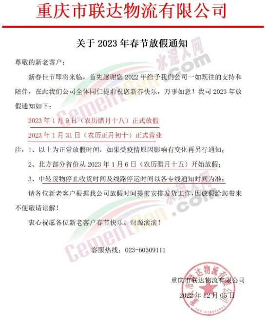 重慶市聯(lián)達(dá)物流有限公司2023年1月9日(農(nóng)歷臘月十八)正式放假,2023年1月31日(農(nóng)歷正月初十)正式營業(yè)。如果受疫情原因影響有變化再另行通知;北方部分省份從2023年1月6日(農(nóng)歷臘月十五)開始放假;中轉(zhuǎn)貨物停止收貨時間及線路停運時間以各專線通知時間為準(zhǔn)。
