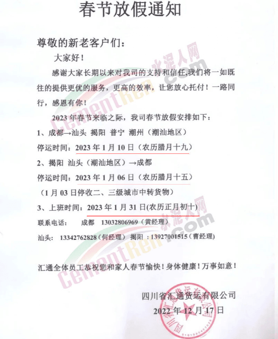 四川省匯通貨運有限公司:成都→汕頭揭陽普寧潮州(潮汕地區(qū))停運時間:2023年1月10日(農(nóng)歷臘月十九)揭陽汕頭(潮汕地區(qū))→成都。停運時間:2023年1月06日(農(nóng)歷臘月十五)。1月03日停收二、三級城市中轉(zhuǎn)貨物。上班時間:2023年1月31日(農(nóng)歷正月初十)