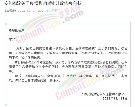 上海安能聚創(chuàng)供應(yīng)鏈管理有限公司通知稱,近期,國內(nèi)疫情防控措施不斷優(yōu)化調(diào)整,疫情防控形勢發(fā)生了新的變化。受疫情、天氣等多重因素影響,安能物流個別地區(qū)攬收和派送服務(wù)時效延遲。