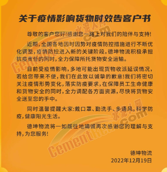 德坤物流關(guān)于疫情影響貨物時效告客戶書稱,近期,全國各地因時因勢對疫情防控措施進(jìn)行不斷優(yōu)化調(diào)整,疫情防控進(jìn)入新的關(guān)鍵階段,疫情影響,多地可能出現(xiàn)貨物收派延誤情況,德坤物流積極承擔(dān)抗疫責(zé)任的同時,全力保障所托貨物安全運輸。