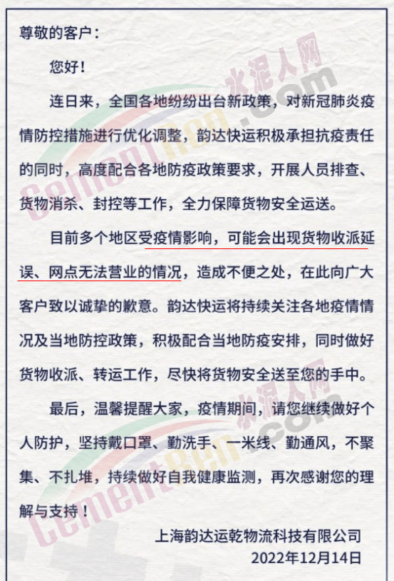 上海韻達(dá)運乾物流科技有限公司通知,連日來,全國各地紛紛出臺新政策,對新冠肺炎疫情防控措施進(jìn)行優(yōu)化調(diào)整,目前多個地區(qū)受疫情影響,可能會出現(xiàn)貨物收派延誤、網(wǎng)點無法營業(yè)的情況,造成不便之處,在此向廣大客戶致以誠摯的歉意。