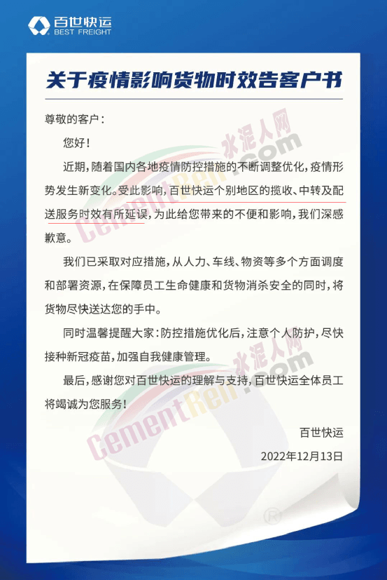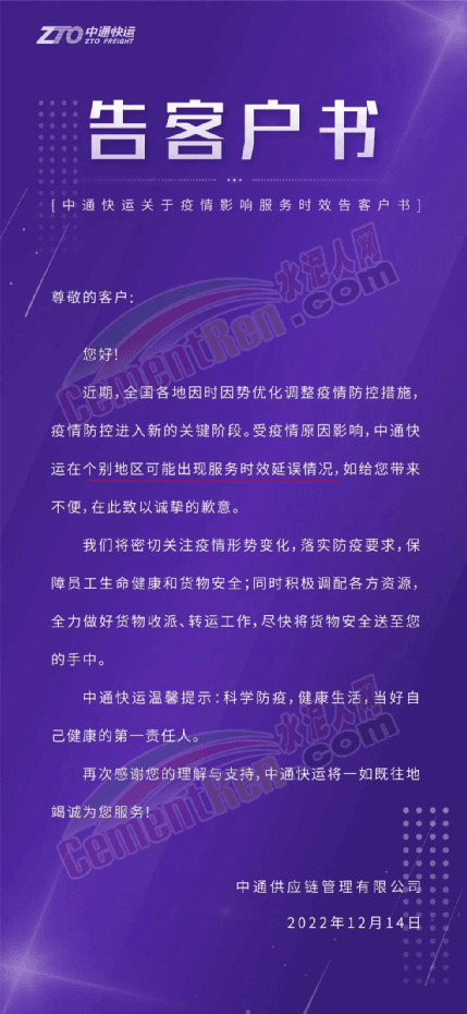 中通快運關(guān)于疫情影響服務(wù)時效告客戶書稱:近期,全國各地因時因勢優(yōu)化調(diào)整疫情防控措施,疫情防控進(jìn)入新的關(guān)鍵階段。受疫情原因影響,中通快運在個別地區(qū)可能出現(xiàn)服務(wù)時效延誤情況,如給您帶來不便,在此致以誠摯的歉意。將密切關(guān)注疫情形勢變化,落實防疫要求,保障員工生命健康和貨物安全;同時積極調(diào)配各方資源,全力做好貨物收派、轉(zhuǎn)運工作,盡快將貨物安全送至您的手中。