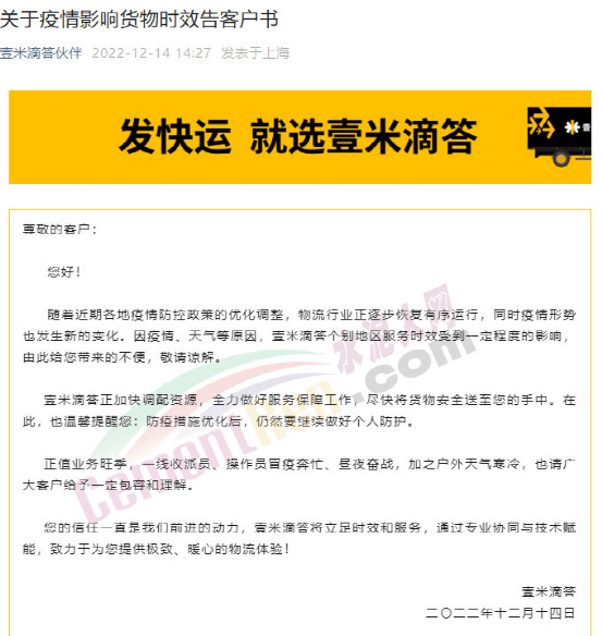 壹米滴答通知,隨著近期各地疫情防控政策的優(yōu)化調(diào)整,物流行業(yè)正逐步恢復(fù)有序運行,同時疫情形勢也發(fā)生新的變化。因疫情、天氣等原因,壹米滴答個別地區(qū)服務(wù)時效受到一定程度的影響。