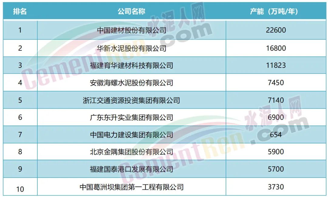 2022年水泥企業(yè)骨料產(chǎn)能TOP10