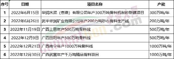 2022年投產(chǎn)6宗骨料項(xiàng)目