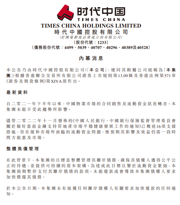 時代中國表示“深受2021年下半年以來,房地產(chǎn)銷售轉(zhuǎn)差的嚴重影響。公司的整體資金緊張,無法公平支付整體的離岸債,所以公司將整體暫停所有離岸債的支付”。這是時代中國第一次以官方公告的方式,承認自己無力支付債務(wù),也就是公開債務(wù)爆雷了。