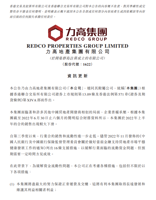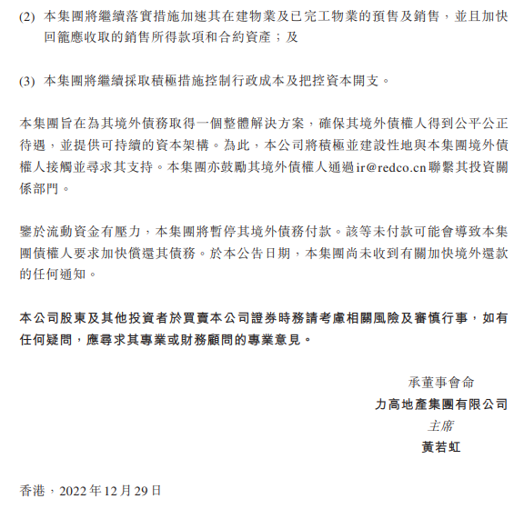 另一家,多年位列中國地產(chǎn)TOP100的力高集團,也在2022年的最后一個工作日發(fā)布公告,鑒于流動資金有壓力,將暫停境外債務(wù)付款。公司將盡最大的努力保證正常運營及交樓。