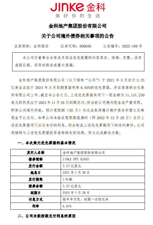 12月28日,金科股份公告稱,一筆金額約1113.125萬美元的利息應(yīng)于 2022年11月28日到期兌付,但當前公司境內(nèi)現(xiàn)金流嚴重受限,即使公司竭盡所能,預(yù)計寬限期30天內(nèi)無法取得履行境外債務(wù)所需之足夠現(xiàn)金予以支付。