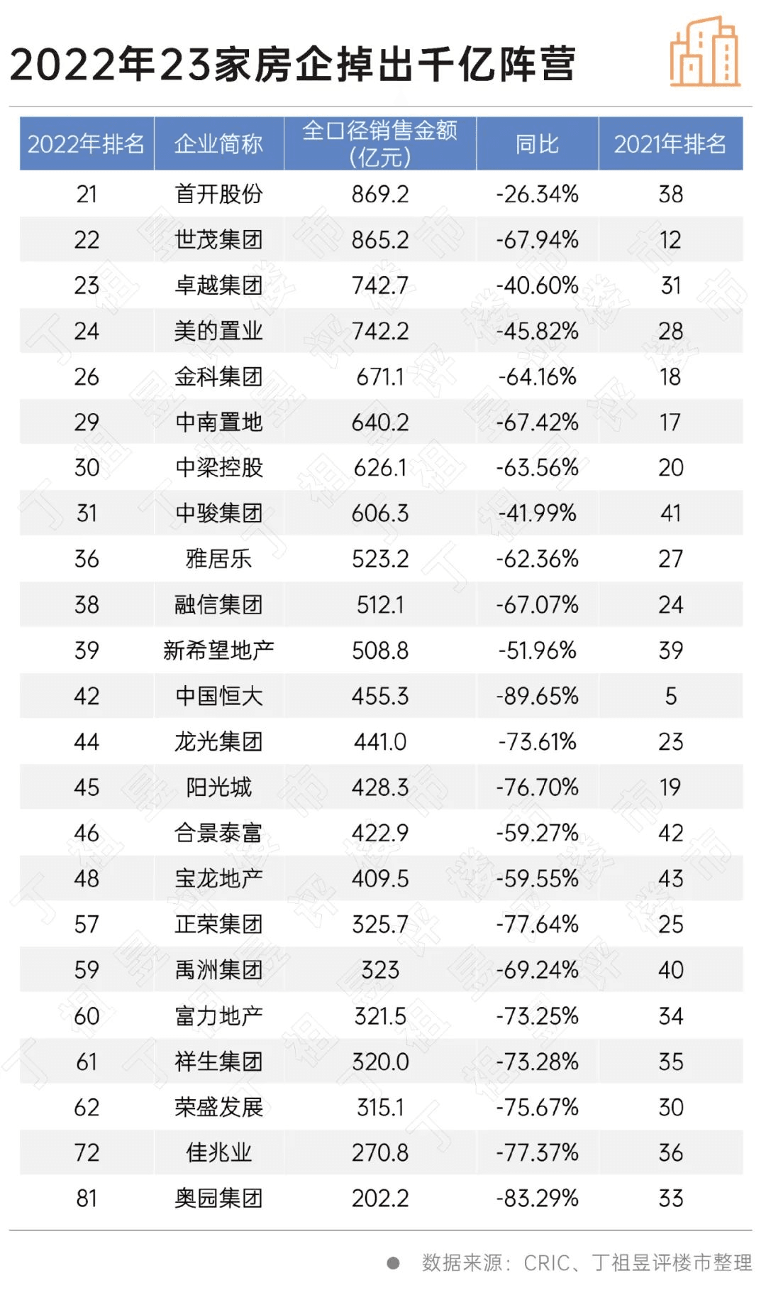 據(jù)水泥人網(wǎng)了解,2022年,多數(shù)規(guī)模房企深陷負增長困局,百強房企全年業(yè)績有九成下滑。2022年成為房企洗牌年,最明顯的標志是,千億房企數(shù)量銳減一半。