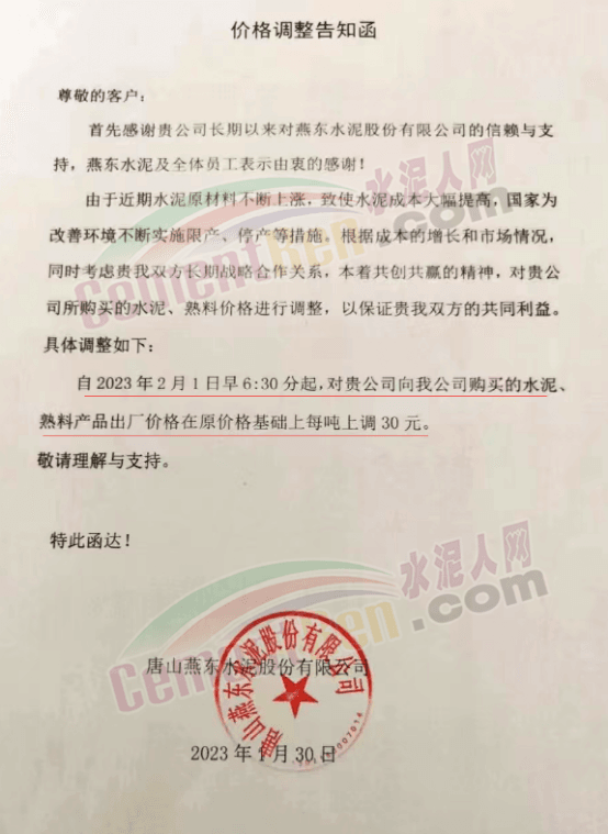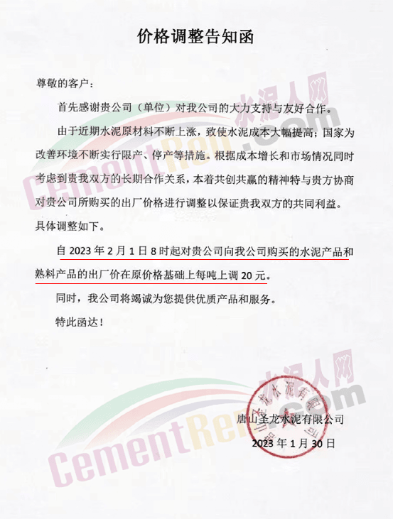 日前,唐山圣龍水泥有限公司、唐山燕東水泥股份有限公司、灤縣磐石水泥有限公司等水泥企業發布價格調整告知函稱,由于近期水泥、熟料原材料不斷上漲,致使水泥、熟料成本大幅提高;國家為改善環境不斷實行限產、停產等措施。根據成本增長和市場情況自2023年2月1日起對水泥、熟料產品的出廠價格上調20元/噸。