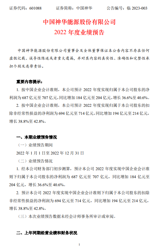 日前,“煤炭一哥”中國神華披露2022年度業(yè)績預(yù)告,預(yù)計2022年實現(xiàn)歸母凈利潤687億元至707億元,同比增長36.6%至40.6%。若按歸母凈利潤上限計算,“煤炭一哥”中國神華預(yù)計2022年度日凈賺1.94億元。