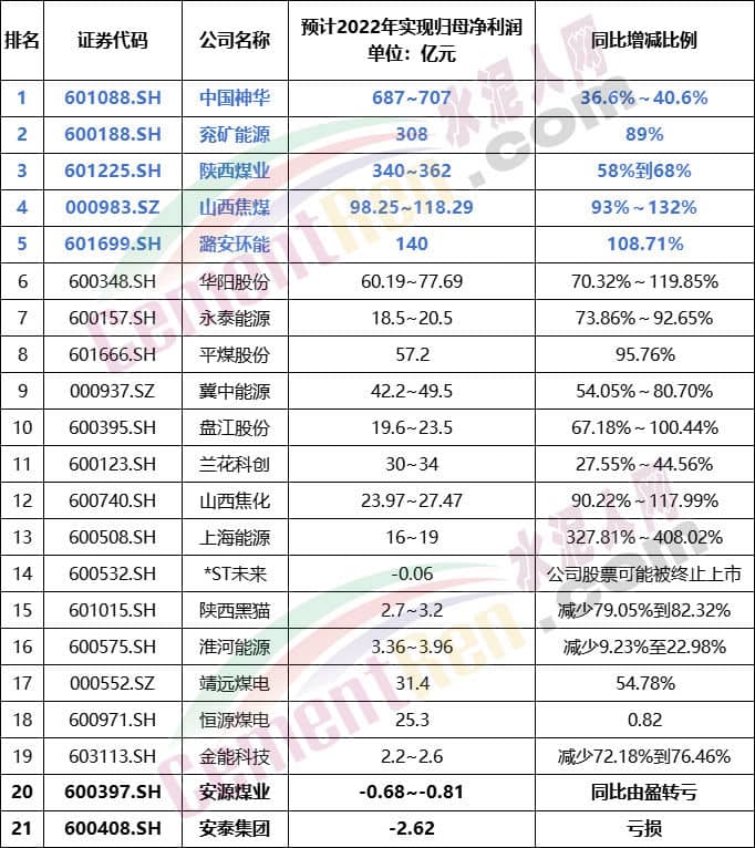 據(jù)上市公司數(shù)據(jù)顯示,截至1月30日晚間,共有21家煤炭上市企業(yè)披露2022年度業(yè)績預(yù)告,其中有中國神華、陜西煤業(yè)、兗礦能源、潞安環(huán)能、山西焦煤5家上市煤企預(yù)計2022年度凈賺上百億元,僅安源煤業(yè)、安泰集團(tuán)兩家上市煤企預(yù)計凈利潤虧損。