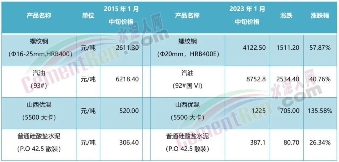 由此可見(jiàn),煤炭的價(jià)格2022年內(nèi)除5000大卡煤炭?jī)r(jià)格漲幅在48.4%外,其他品種煤價(jià)漲幅均超50%。同時(shí)段P.O42.5包裝水泥均價(jià)436.12元/噸,年內(nèi)下跌94.4元/噸,跌幅17.78%;散裝水泥年內(nèi)均價(jià)399.7元/噸,年內(nèi)跌價(jià)88元/噸,跌幅18.04%。煤價(jià)漲了一半以上,水泥價(jià)格卻跌了近20%。