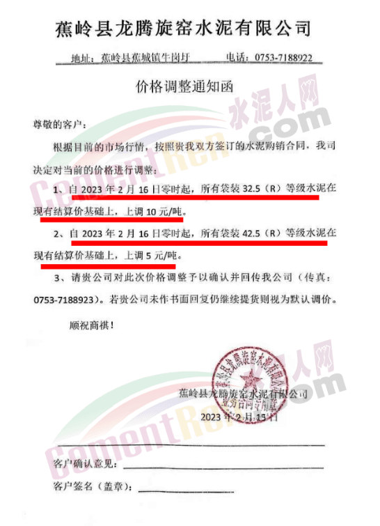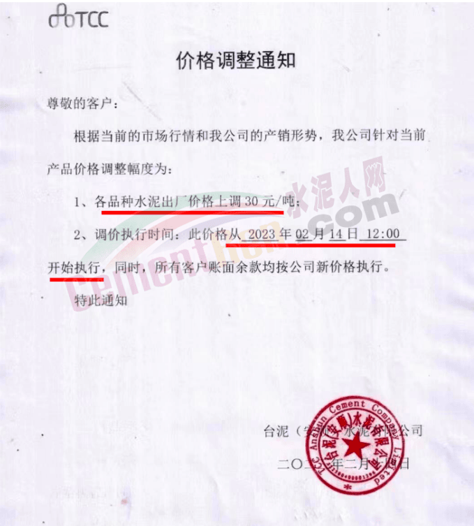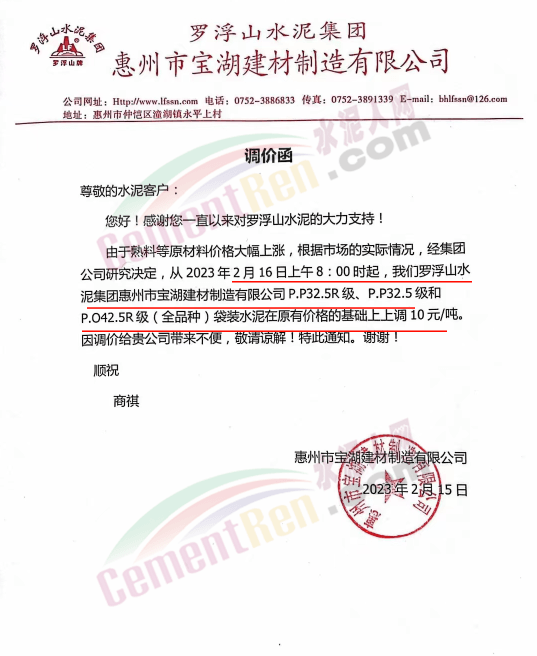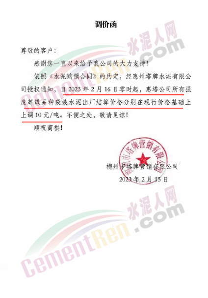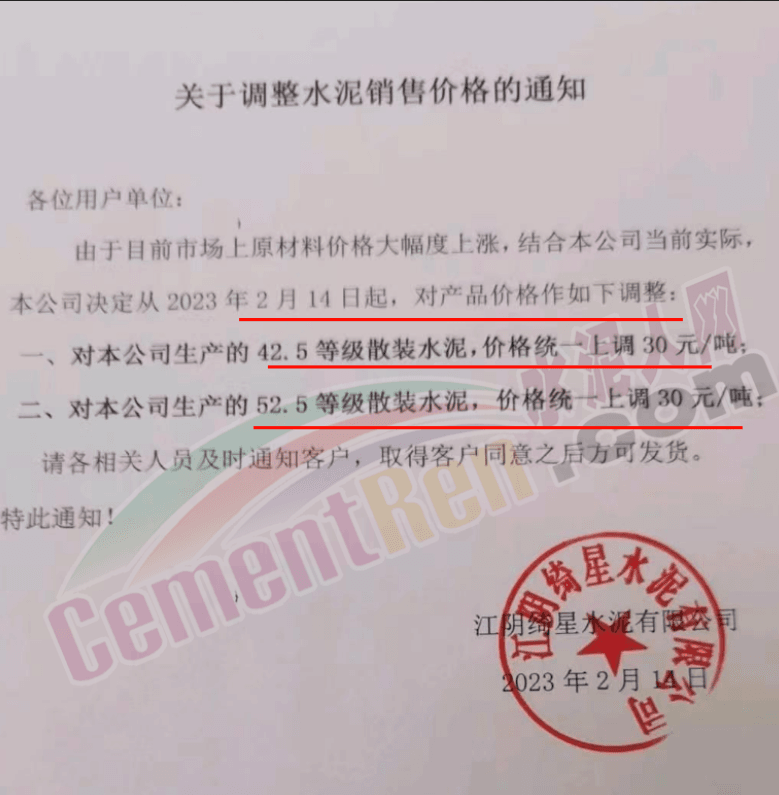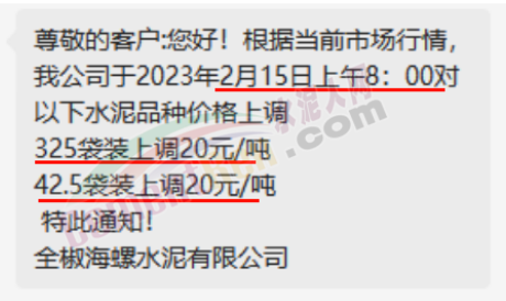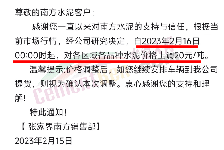 張家界南方銷售部通知,自2023年2月16日0時(shí)起,對(duì)各區(qū)域各品種水泥價(jià)格上調(diào)20元/噸。