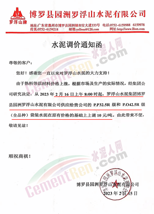 博羅縣園洲羅浮山水泥、羅浮山水泥惠州市寶湖建材通知,2月16日8時(shí)起,水泥價(jià)格上調(diào)10元/噸。