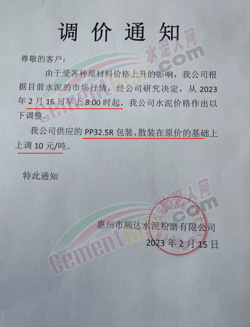 惠州順達(dá)水泥粉磨公司通知2月16日8時(shí)起PP32.5R水泥上調(diào)10元/噸。
