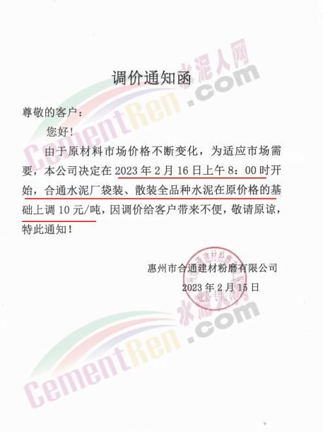 惠州市合通建材粉磨有限公司通知2月16日上午8時(shí)起,水泥價(jià)格上調(diào)10元/噸。
