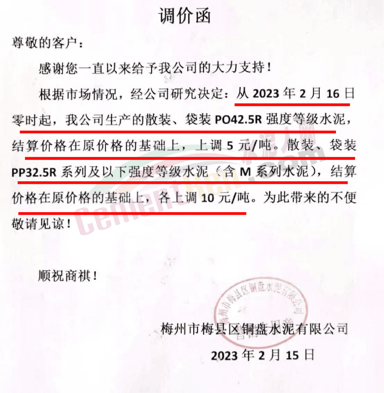 梅州市梅縣區(qū)銅盤水泥有限公司通知,從2023年2月16日零時(shí)起,公司生產(chǎn)的散裝、袋裝PO425R 強(qiáng)度等級(jí)水泥,結(jié)算價(jià)格在原價(jià)格的基礎(chǔ)上,上調(diào)5元/噸。散裝、袋裝PP32.5R系列及以下強(qiáng)度等級(jí)水泥(含M系列水泥),結(jié)算價(jià)格在原價(jià)格的基礎(chǔ)上,各上調(diào)10 元/噸。