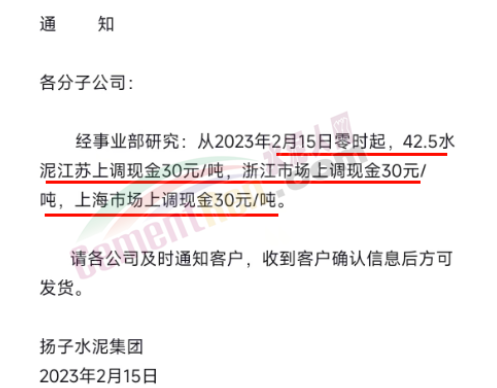 揚(yáng)子水泥集團(tuán)通知,2月15日零時(shí)起,江浙滬市場(chǎng)42.5水泥上調(diào)30元/噸。