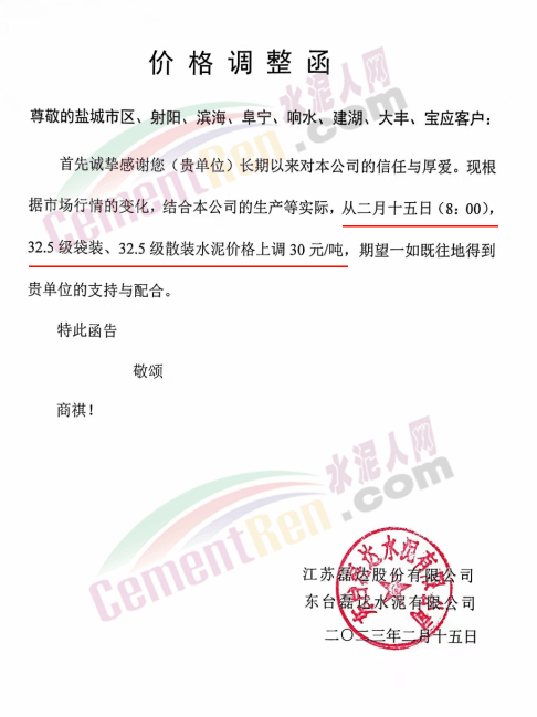 磊達(dá)水泥通知,對(duì)鹽城市區(qū)、射陽(yáng)、濱海、阜寧、響水、建湖、大豐、寶應(yīng)客戶從2月15日8時(shí)起,32.5 級(jí)袋裝、32.5級(jí)散裝水泥價(jià)格上調(diào) 30元/噸。