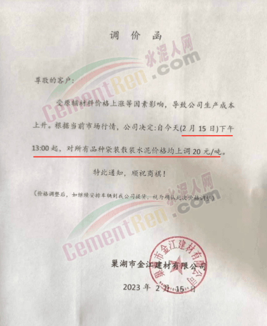 安徽巢湖金江建材通知,2月15日起對(duì)各品種袋裝,散裝水泥價(jià)格上調(diào)20元/噸。